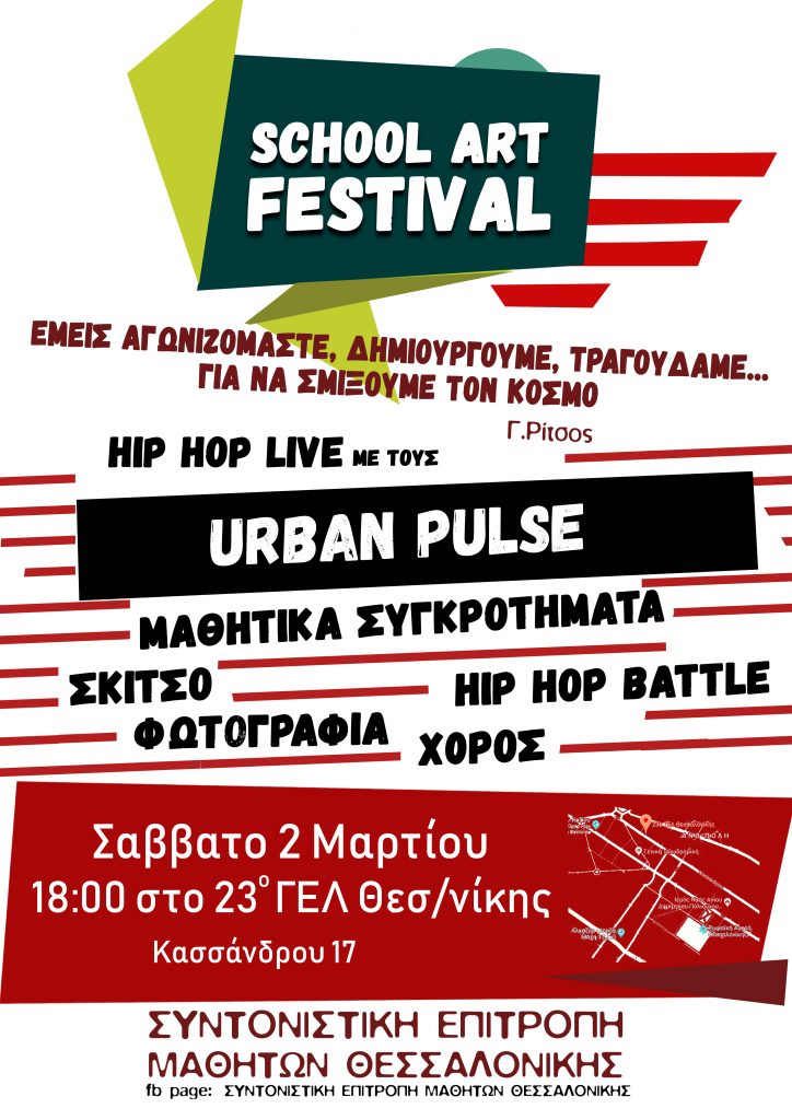 H Συντονιστική Επιτροπή Μαθητών Θεσσαλονίκης καλεί όλα τα σχολεία, όλα τα 15μελή και 5μελή, μαθητικές πολιτιστικές ομάδες και συγκροτήματα να πάρουμε μια μεγάλη πρωτοβουλία!!! Να οργανώσουμε για πρώτη φορά στην πόλη της Θεσσαλονίκης ένα School Art Festival στις 2 Μάρτη, με σύνθημα “Γιατί εμείς δεν τραγουδάμε για να ξεχωρίσουμε αδερφέ μου από τον κόσμο. Εμείς τραγουδάμε για να σμίξουμε τον κόσμο”.